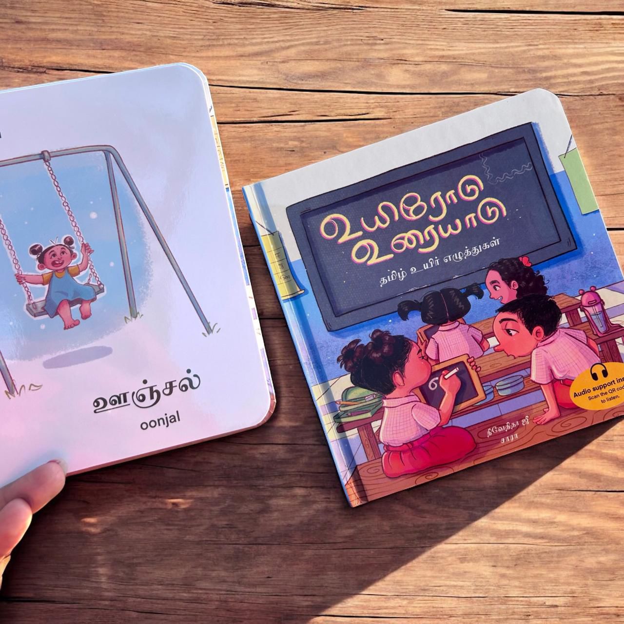 Includes a must-have Mei Ezhuthukal board book, unique for its inclusion of an English transliteration on each page, and a beautifully illustrated Uyirodu Uraiyaadu book as a companion.