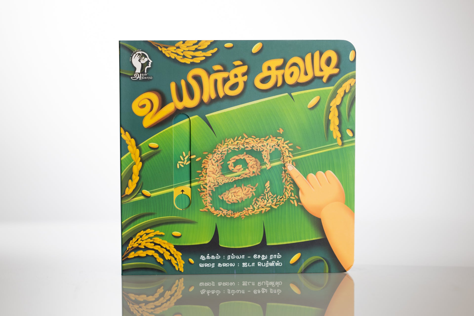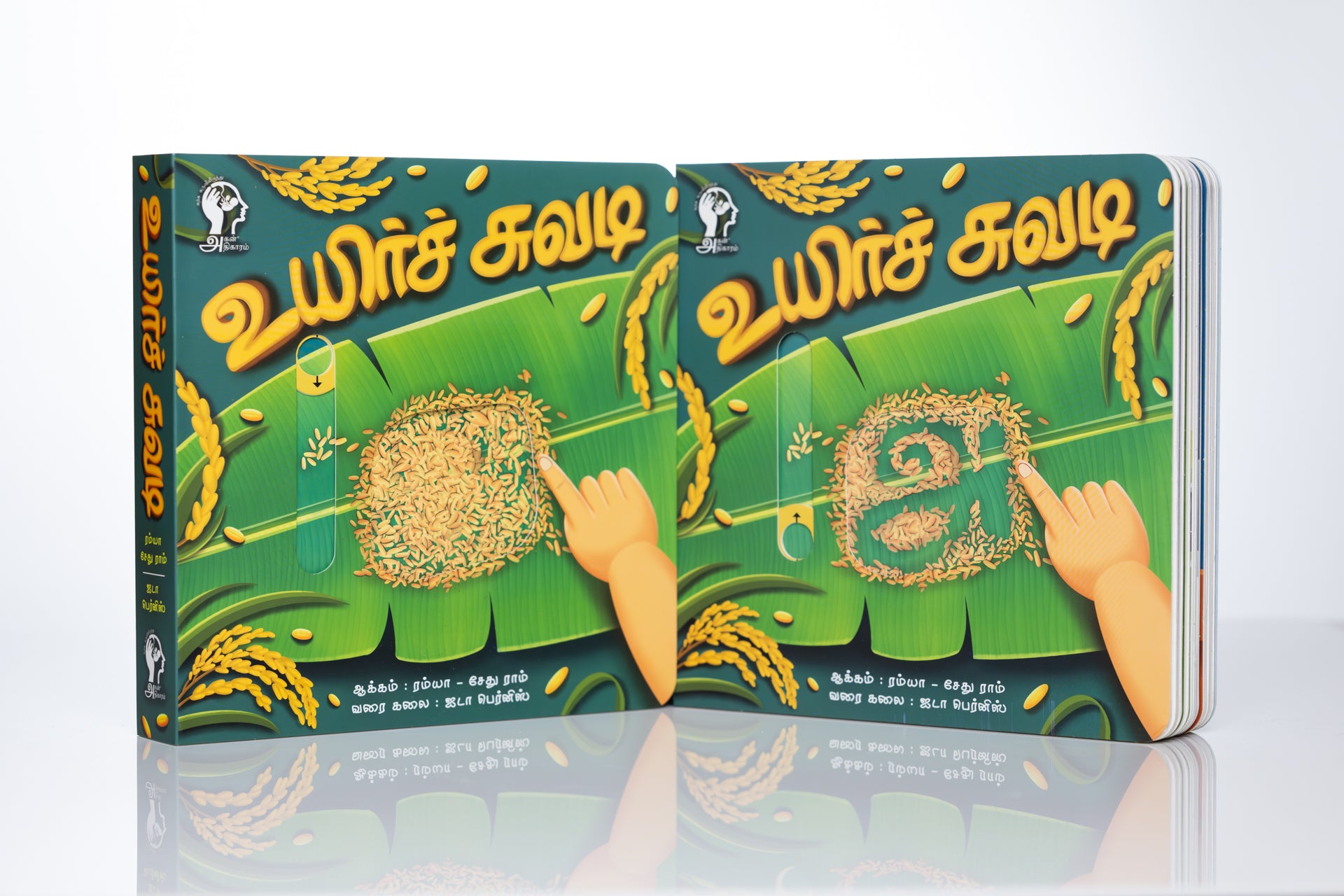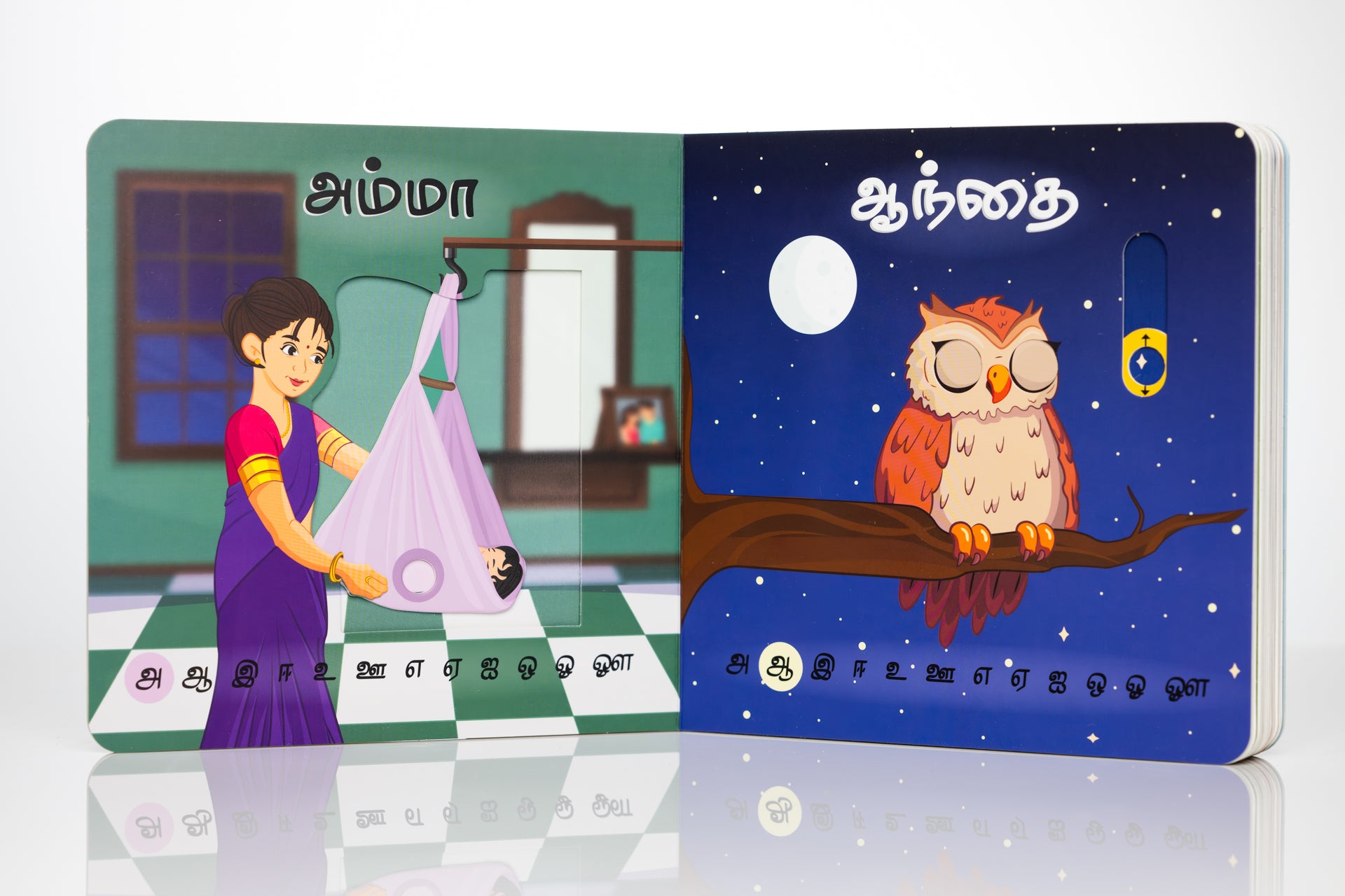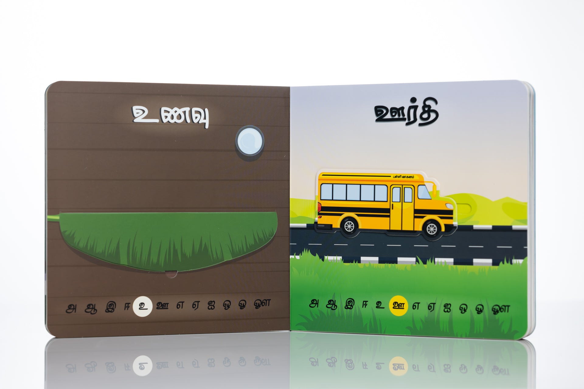 A high-end, innovative Tamil childrenâs book that introduces Tamil vowels in an interactive way. There is an interactive element on each and every page including moveable parts, lift-the-flap and touch-and-feel.Â